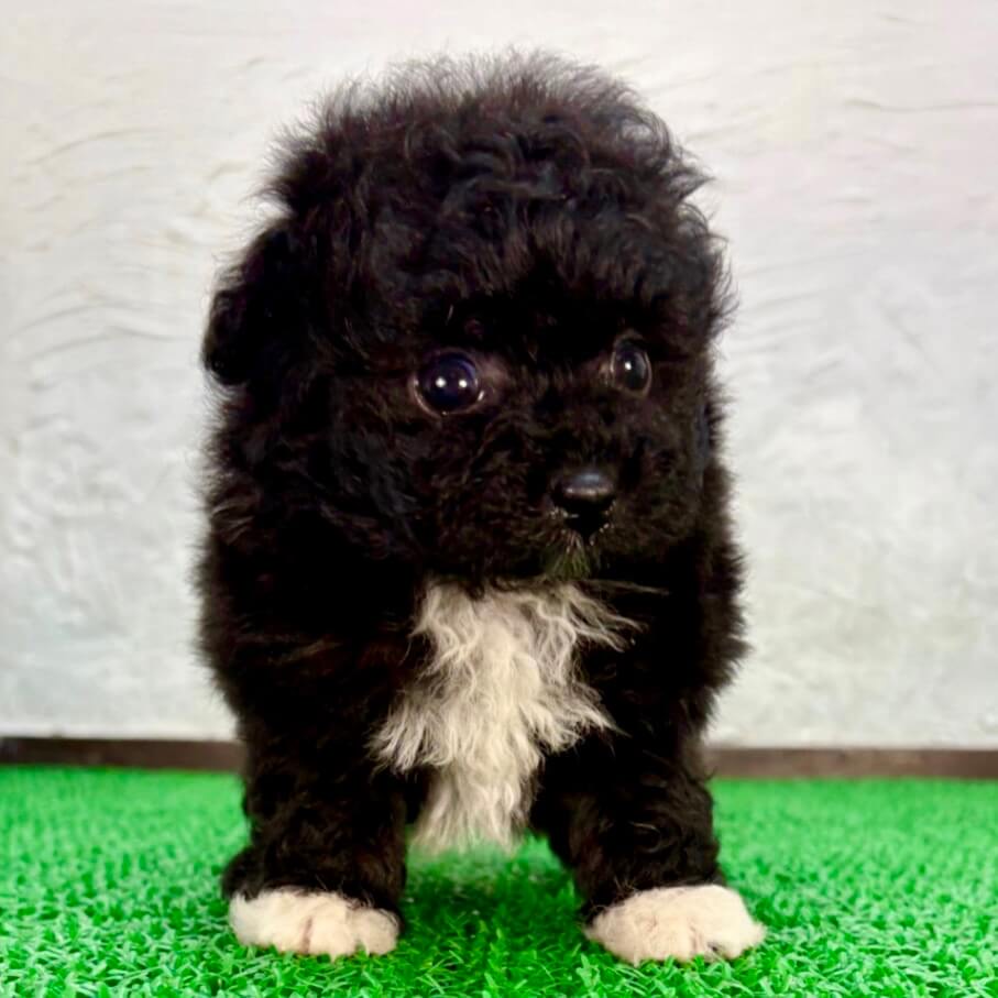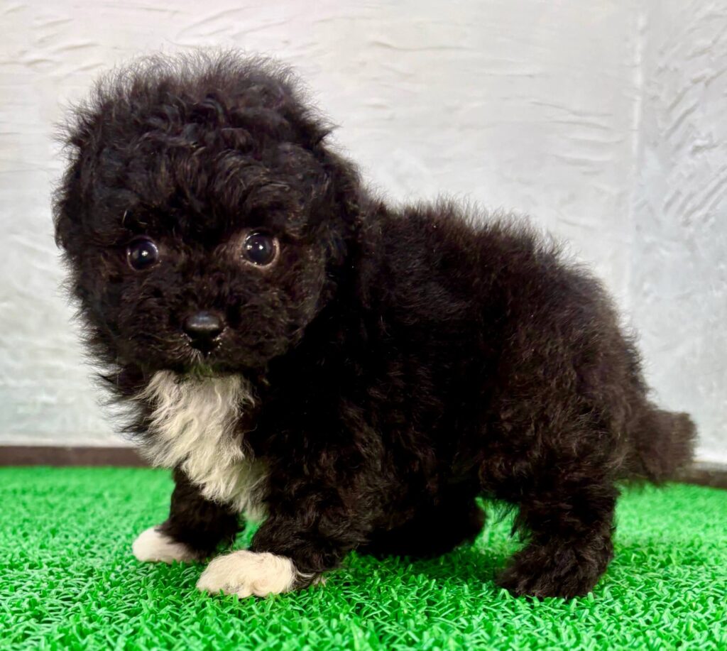 パーティーカラー(ブラック&ホワイト)のポメプーは、黒と白の模様が入る希少なレアカラーです。ブラックホワイトのポメプーは数が少なく、子犬販売でも人気があります。