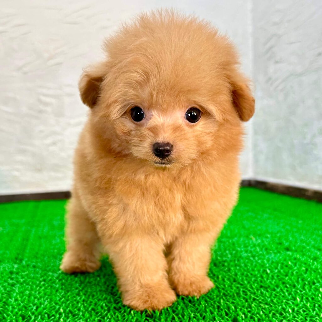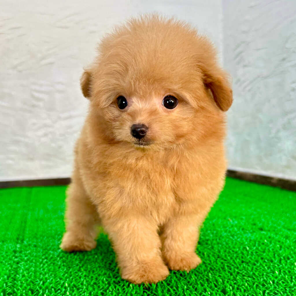 アプリコットカラーのポメプーは、温かみのある毛色とふわふわの毛並みが魅力の人気カラーです。ポメラニアンとトイプードルの可愛さを受け継いだアプリコットのポメプーは、優しい雰囲気と愛らしい表情で多くの方に人気があります。