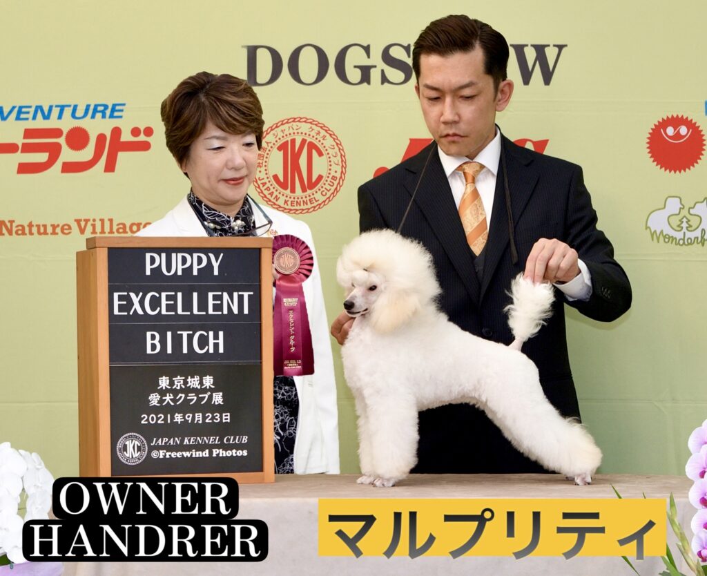 このトイプードルはドッグショーにおいてEXCELLENT賞を受賞しており、毛量、骨格、目の大きさ、性格などバランスの取れた犬質が評価されています。