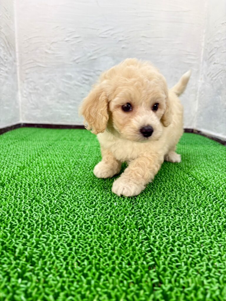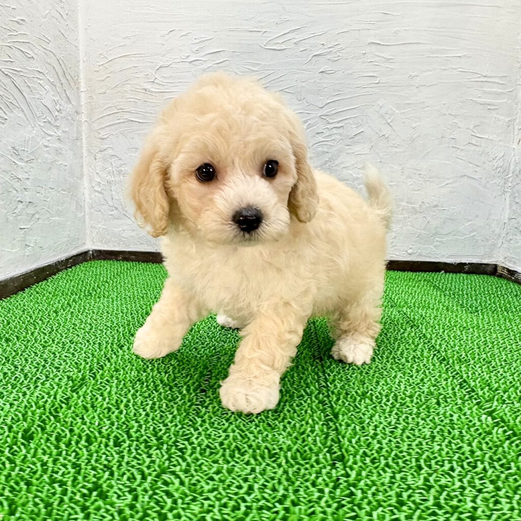 ビションフリーゼとトイプードルのミックス犬の、とても可愛らしいクリームの男の子です。ふわっと柔らかいクリームカラーの被毛に、クリクリとした大きな瞳がよく映え、見た瞬間に心をつかまれる愛らしい表情をしています。ビションフリーゼのふわふわ感と、トイプードルの可愛い顔立ちをどちらも受け継いだ理想的なミックス犬で、柔らかい雰囲気の子犬を探している方に特に人気のタイプです。
