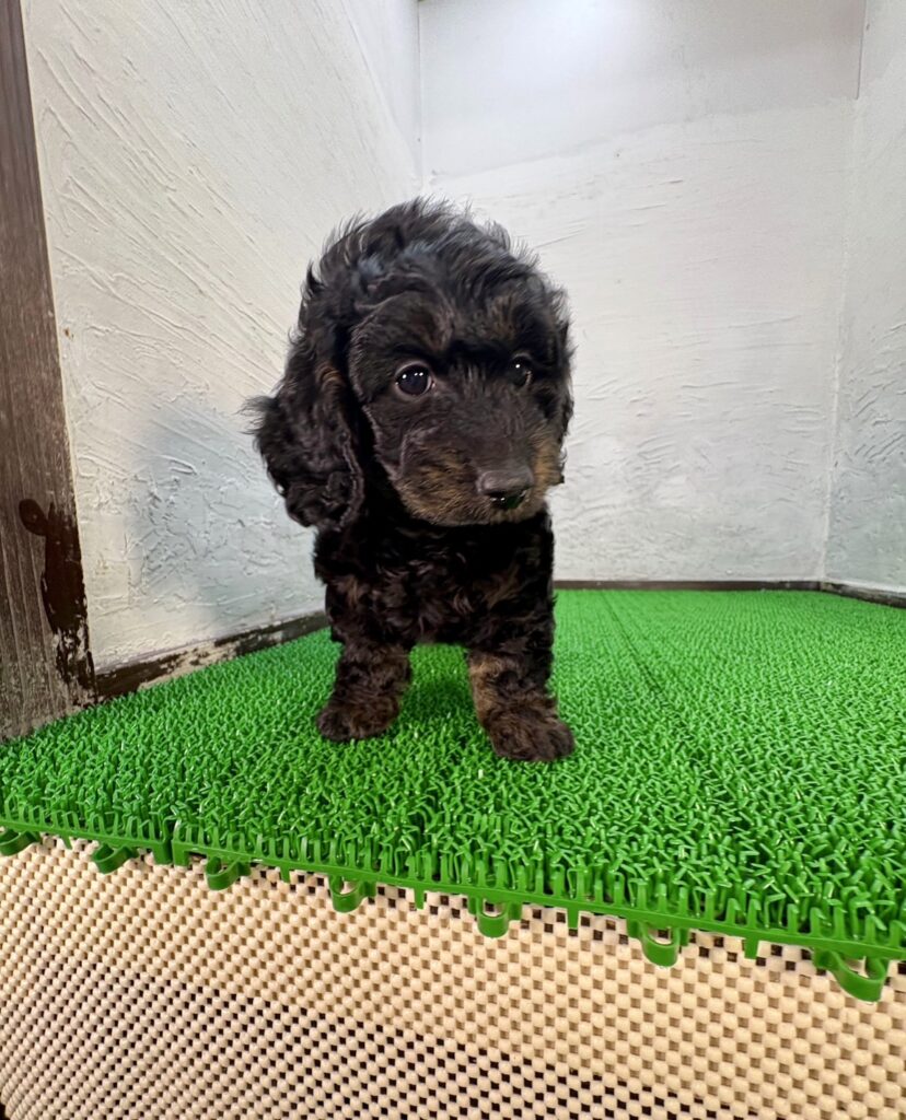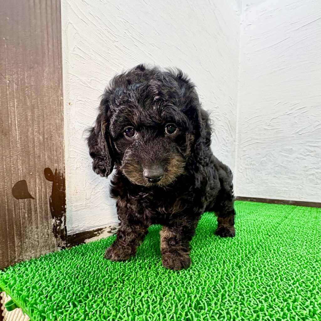 ブラック&タンの毛色が魅力的なダップーの男の子が、マルプリティに仲間入りしました。ダックスフンドとトイプードルの特徴をあわせ持つミックス犬ならではのかわいらしい見た目で、つぶらな瞳と元気いっぱいの表情が印象的です。毛並みはやわらかく、抱っこするとふんわりとした手触りで癒されること間違いなしの子犬です。