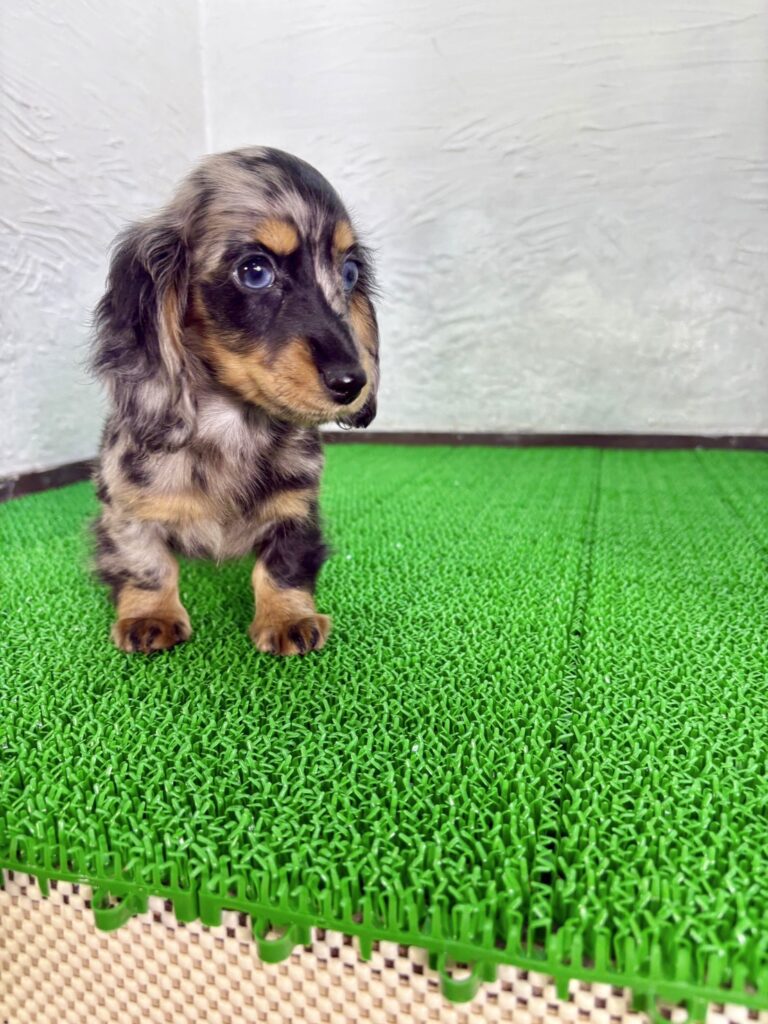 ミニチュアダックスの中でも珍しい、シルバーダップルにソリッドブルーアイが映えるとても美しい子犬です。柄の入り方が絶妙で、全体のカラーバランスが非常に綺麗。クリクリとした大きな瞳にブルーアイが輝き、見た瞬間に心をつかまれるビジュアルの子犬です。ミニチュアダックスを探している方の中でも希少性が高く、「シルバーダップル 子犬」「ブルーアイ ダックス」などで検索する方に特に人気が出るタイプです。