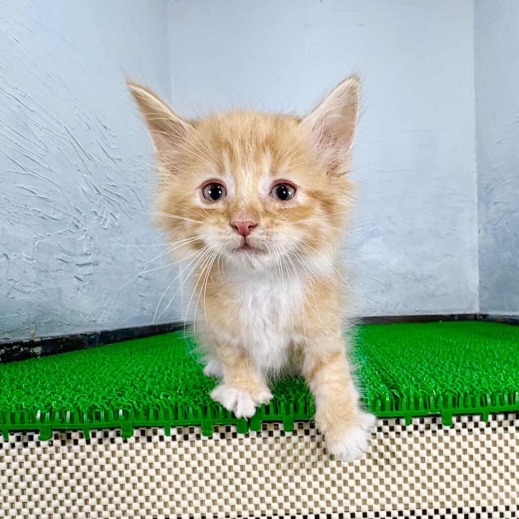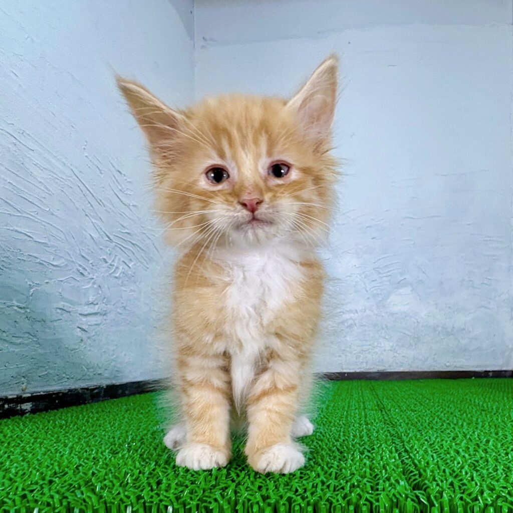 鮮やかなレッドタビーにホワイトが美しく映える、メインクーンの男の子がマルプリティに仲間入りしました。はっきりとした縞模様と胸元や足先のホワイトカラーが印象的で、存在感がありながらもとてもかわいい表情を見せてくれる子猫です。成長とともに被毛の色味や模様がさらに豊かになるのも、この毛色ならではの楽しみです。