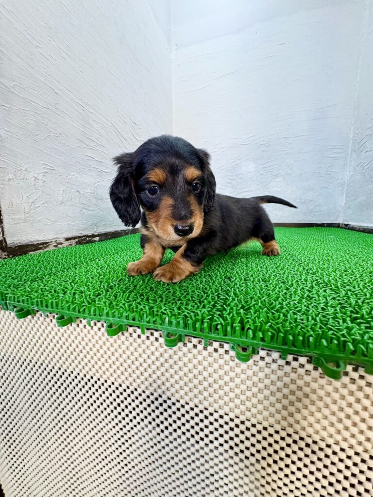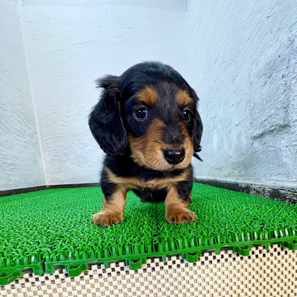 つぶらな瞳と長い被毛が魅力の、ミニチュアダックスロングの男の子です。ブラック&タンのコントラストが美しく、ダックスらしい凛とした表情と可愛らしさをあわせ持っています。
