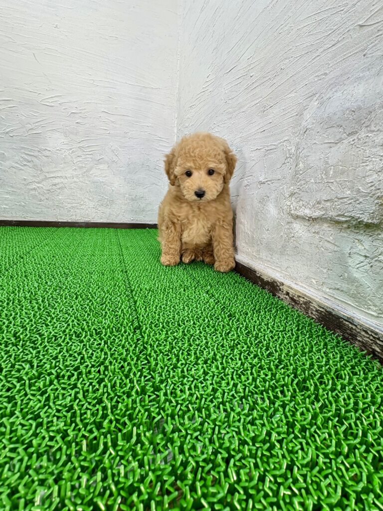 やわらかいアプリコットの毛色がとてもかわいい、トイプードルの男の子がマルプリティに仲間入りしました。ふわふわの巻き毛と小さな体に愛らしい表情をあわせ持つ、まさにぬいぐるみのような子犬です。性格は明るく甘えん坊で、人と触れ合うことが大好き。抱っこされると安心して身をゆだね、家族のそばにいる時間を心から楽しむタイプです。