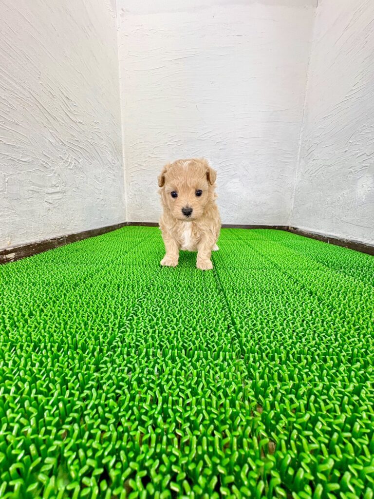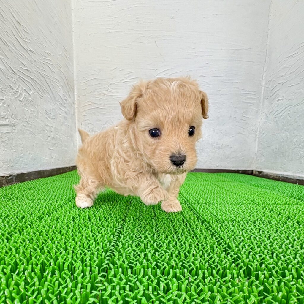アプリコット&ホワイトの優しい色合いと、愛情深い性格で、毎日の暮らしを明るくしてくれる存在。そばにいるだけで自然と笑顔になれる、癒し系マルプーの男の子です。