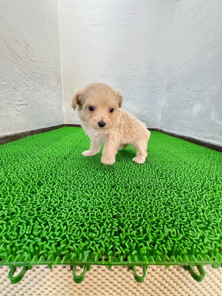 明るく優しいアプリコットカラーが魅力の、マルプーの男の子です。ふんわりとした被毛とくりっとした瞳が印象的で、見ているだけで癒される可愛らしさを持っています。