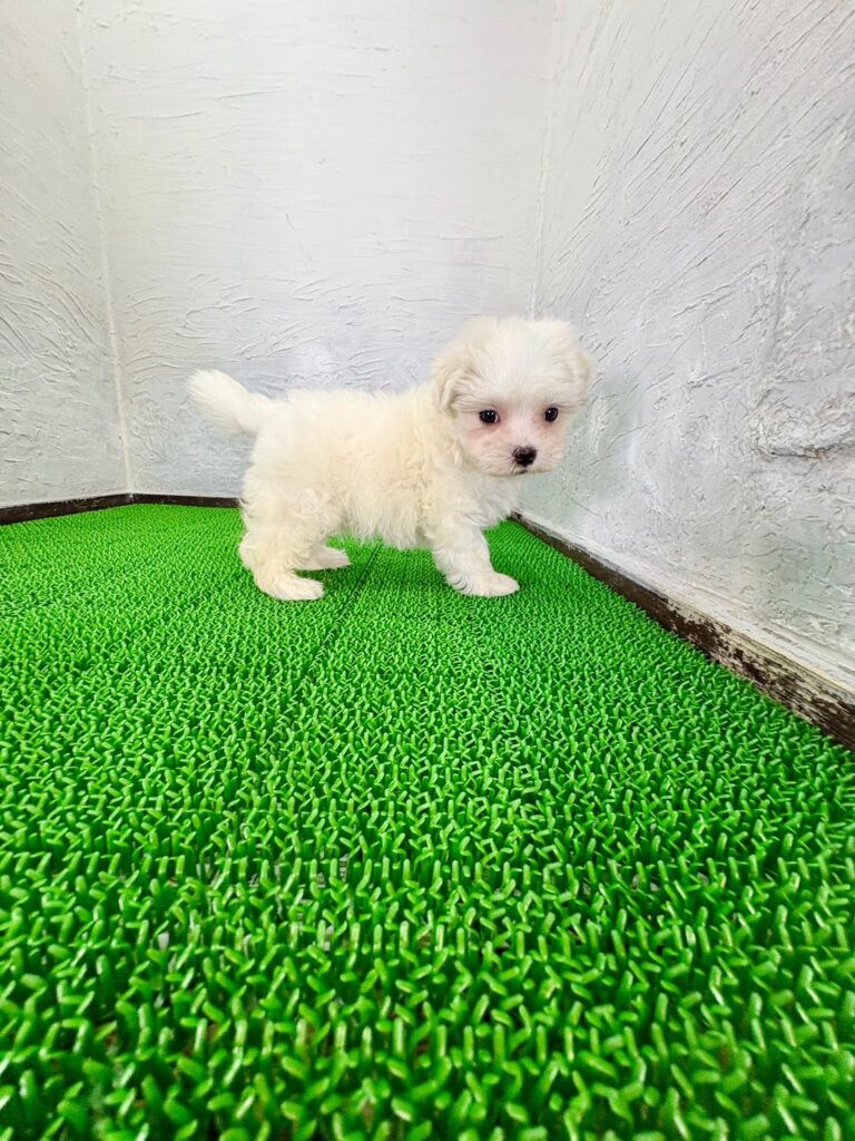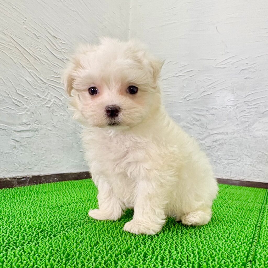 ふんわりとしたホワイトにやわらかなクリームが重なる、優しく明るい毛色が魅力のマルプーの男の子です。