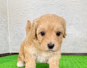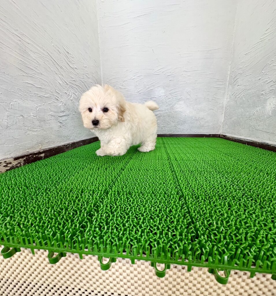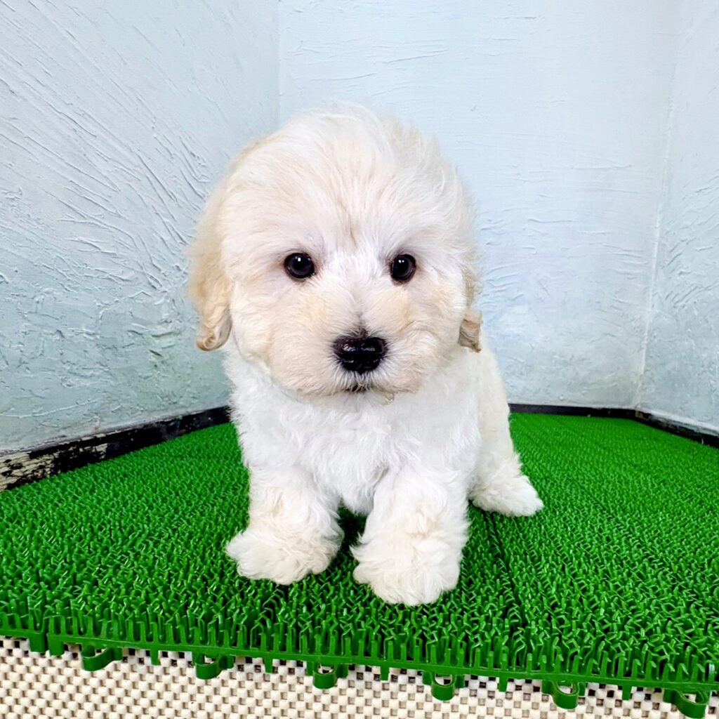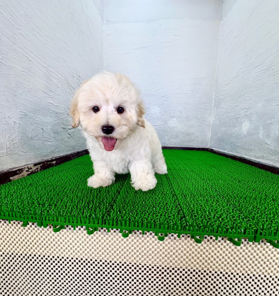 真っ白とクリームのふんわりとした被毛がとても魅力的な、マルプーの男の子です。
