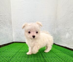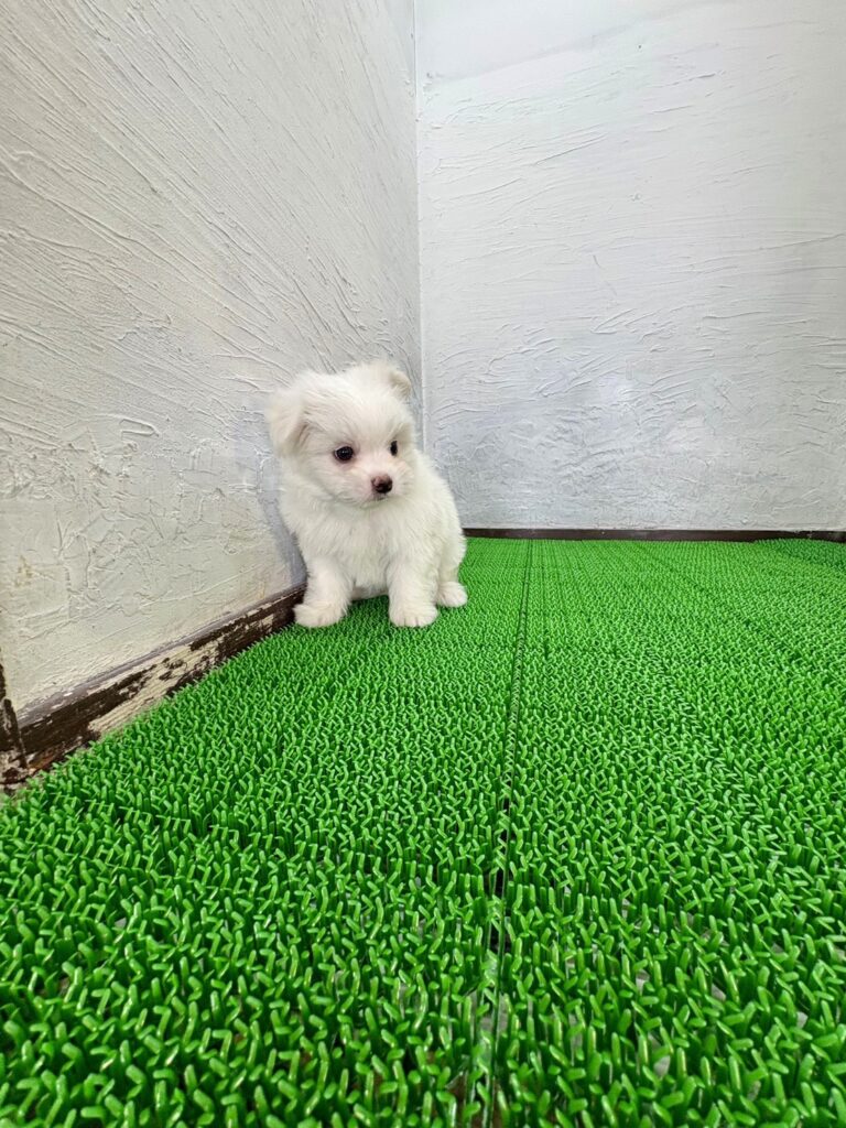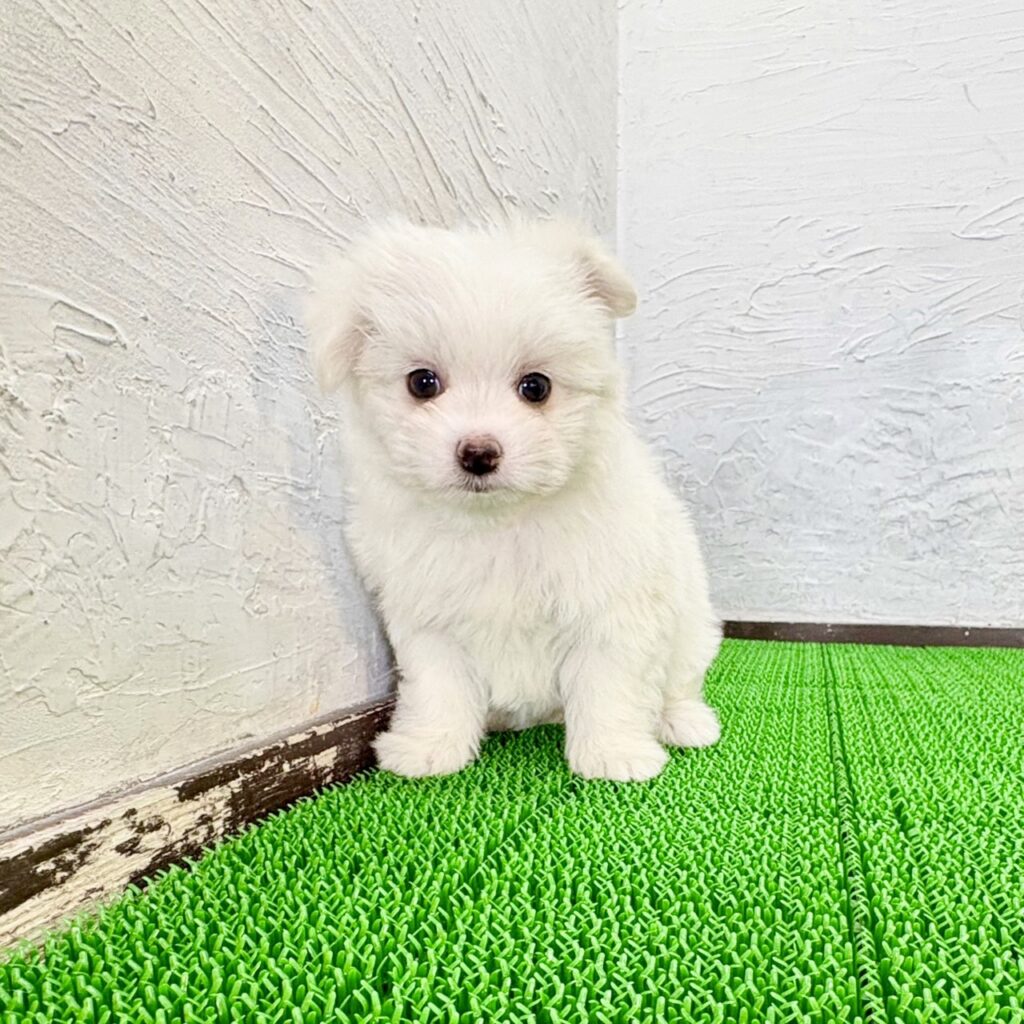 ふわふわのホワイトの被毛がとても印象的な、ポメマルの男の子です。ポメラニアンのもこっとした毛量感と、マルチーズの上品でやさしい雰囲気をあわせ持ち、まるでわたあめのような愛らしさ。真っ白な毛色は清潔感があり、お顔立ちの可愛さをより一層引き立てています。