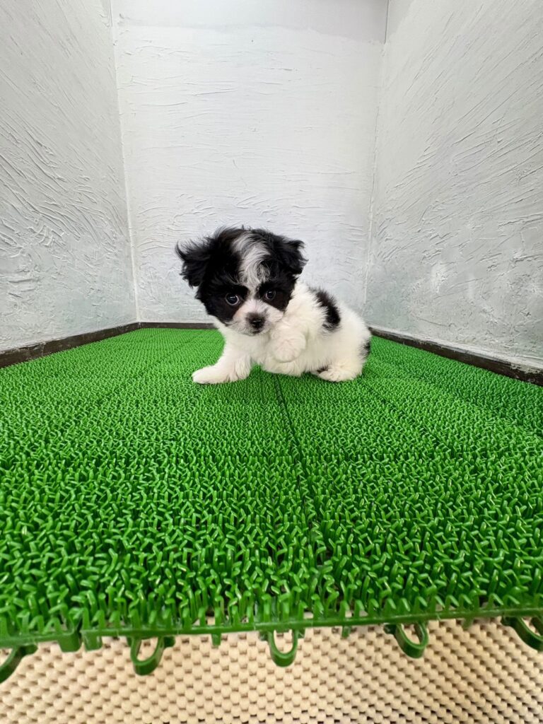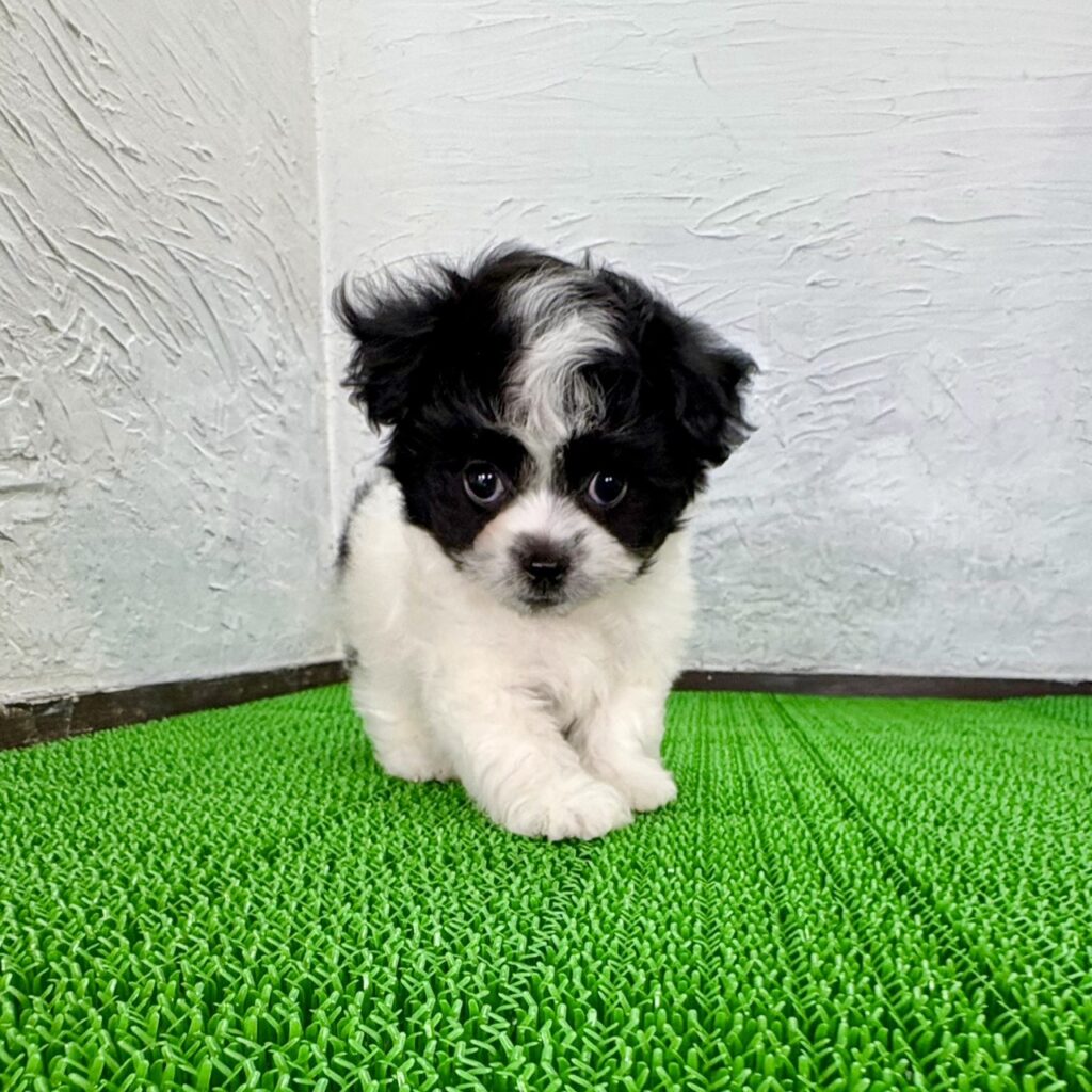 ふわっとしたホワイトをベースに、ブラックの差し色が映えるとてもおしゃれな毛色のチワビションの男の子です。チワワの愛らしい表情と、ビションフリーゼのもこもこした被毛感をあわせ持ち、ぬいぐるみのような可愛さが魅力。白黒のコントラストがはっきりしていて、お顔立ちもとても印象的です。