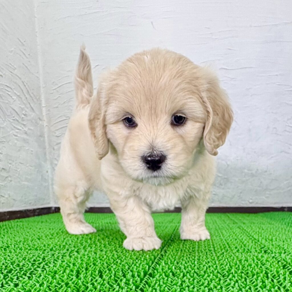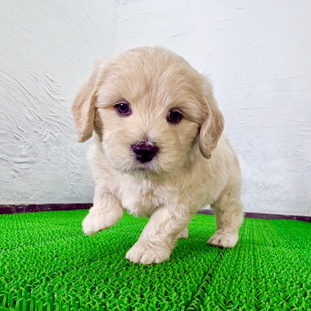 やわらかなクリームカラーがふんわりと優しい印象を与える、スタンプー×キャバシーズーの男の子です。