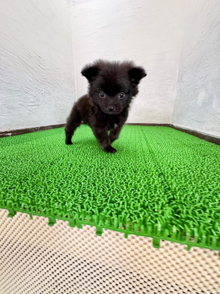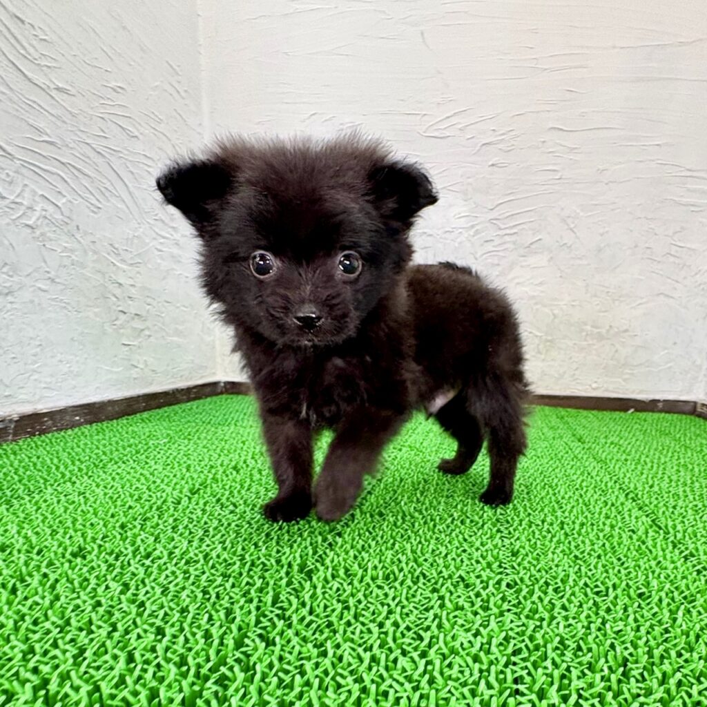 つややかなブラックの被毛がとても印象的な、ポメプーの男の子です。