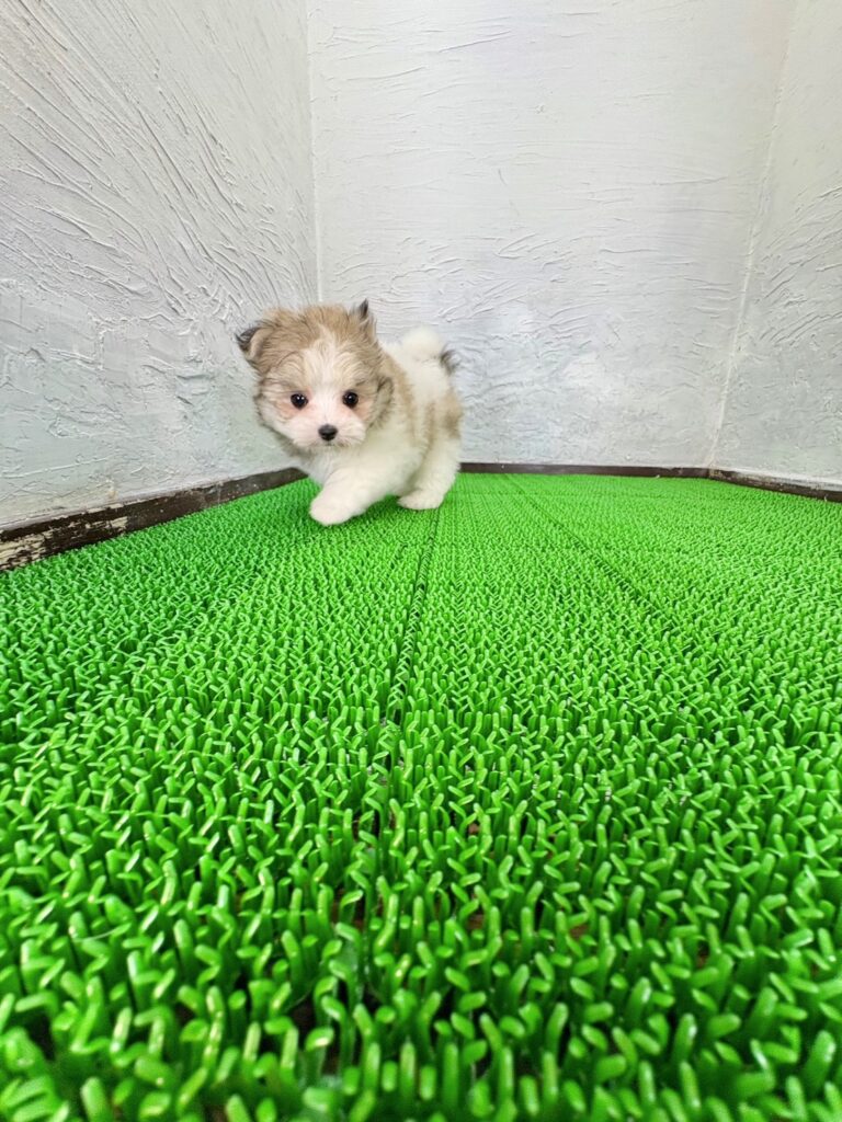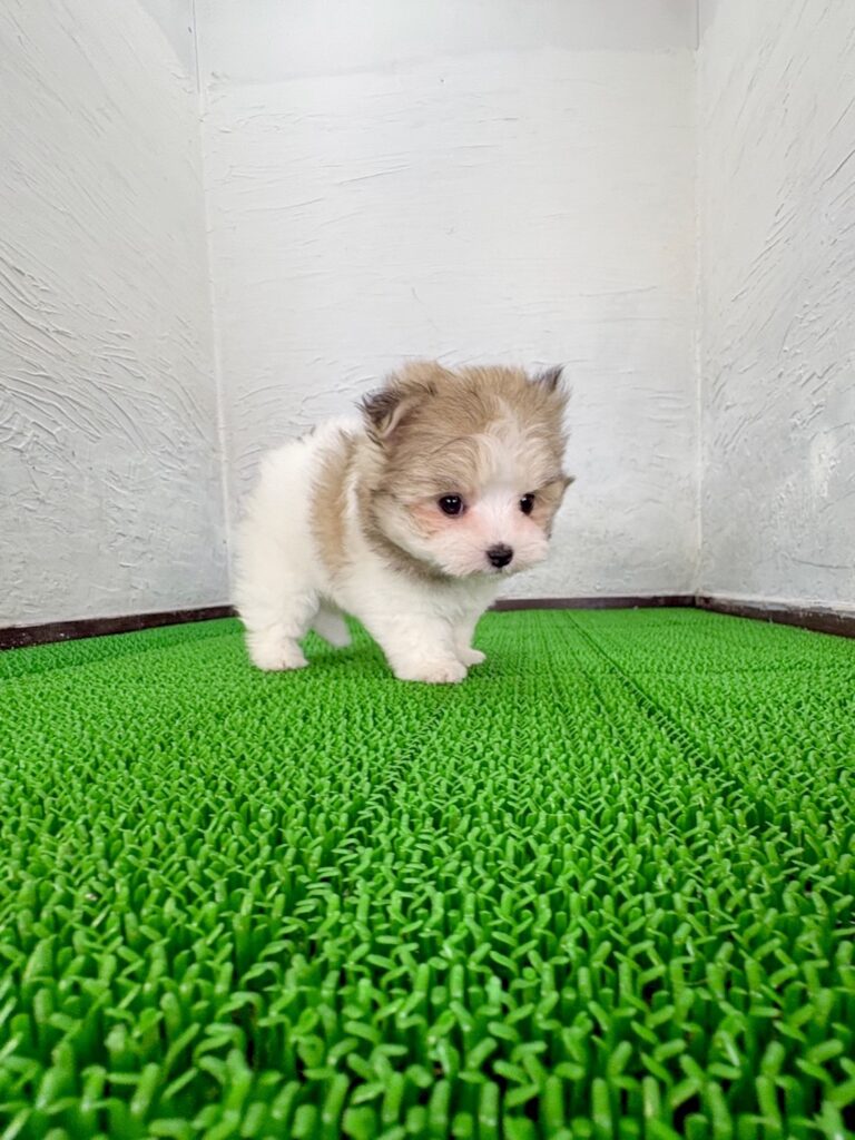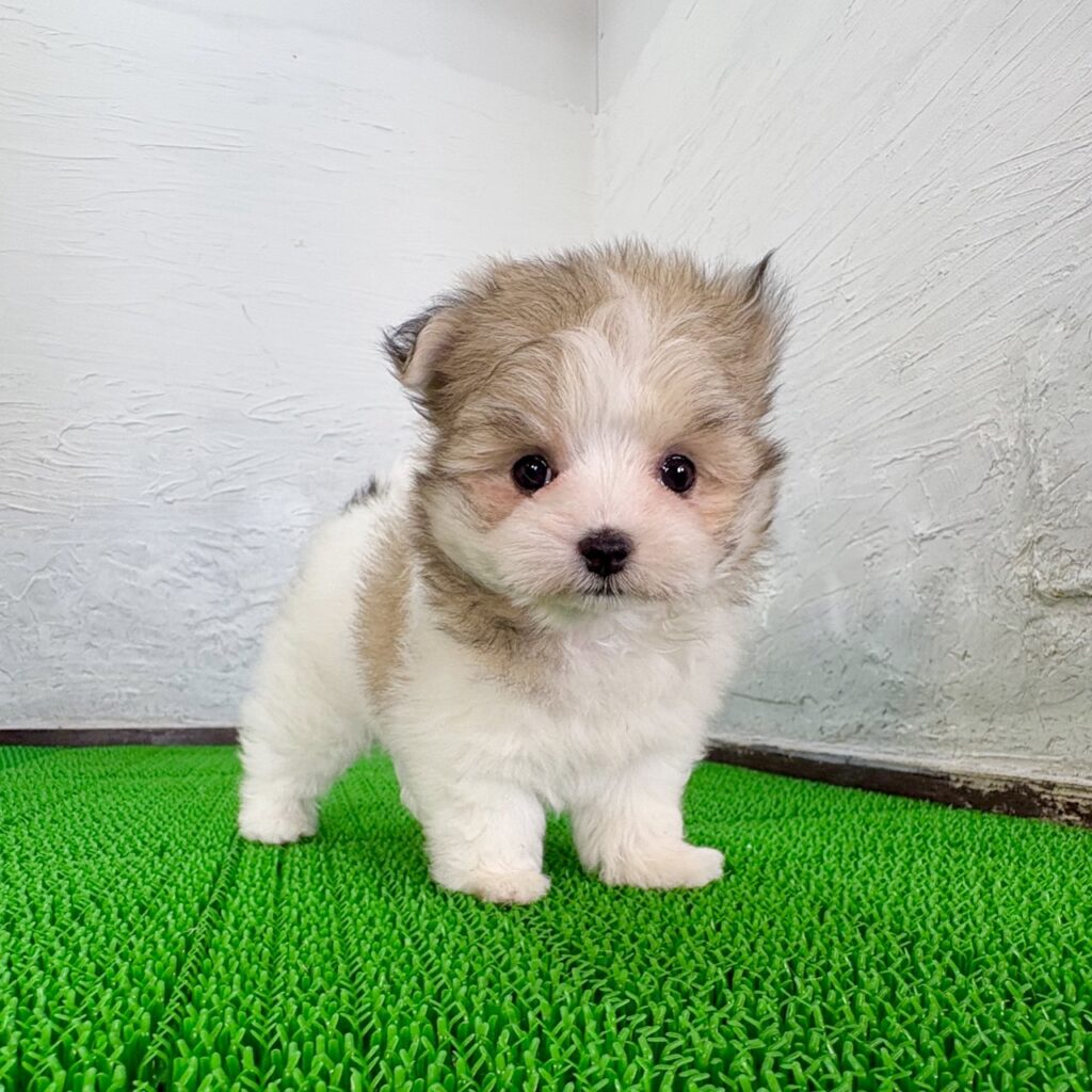 ポメラニアンのふんわりとした被毛と、マルチーズの上品な可愛らしさをあわせ持つ、目を引く存在です。
