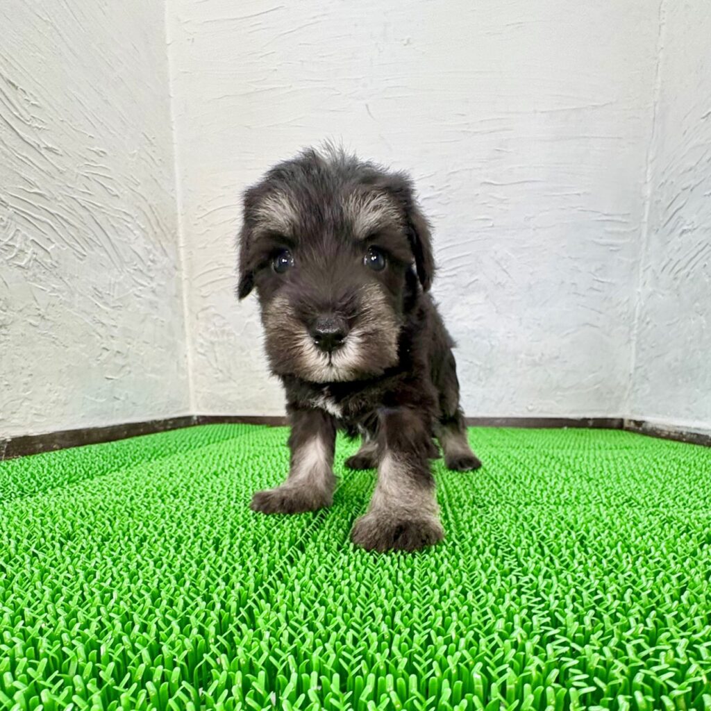 キリッとした眉と愛嬌たっぷりのおひげがチャームポイントの、ミニチュアシュナウザーの男の子です。毛色は定番人気のソルト&ペッパー。メリハリのある美しい被毛で、成長とともによりシュナウザーらしい風格が増していきます。