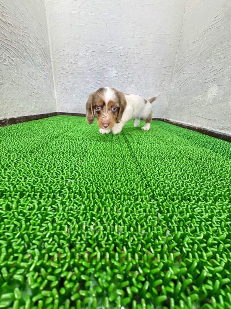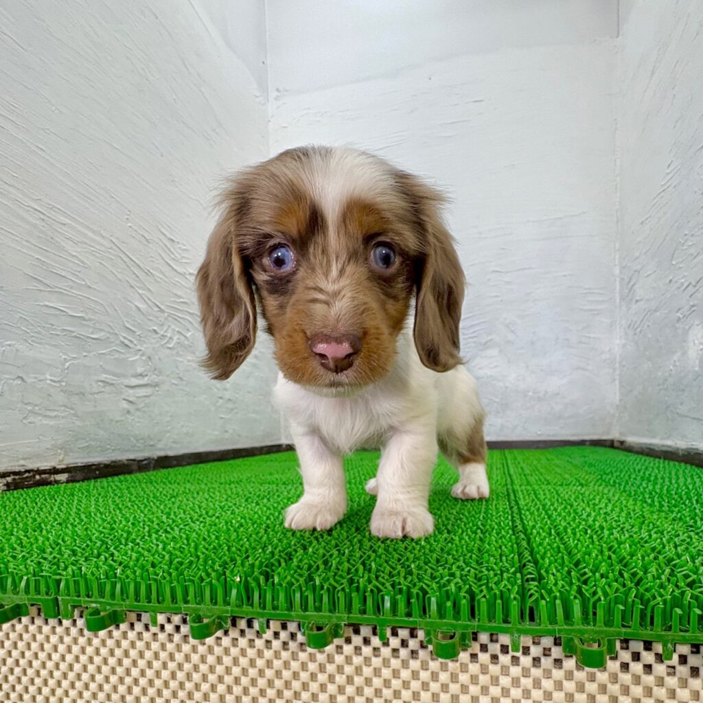 個性的で華やかなホワイト&チョコレートダップルカラーが目を引く、ミニチュアダックスフンド(ロング)の男の子です。やわらかく美しい長毛に、ダップル特有の模様が重なり合い、思わず見惚れてしまうような存在感。成長とともに毛色の表情が変化していくのも、このカラーならではの楽しみです。