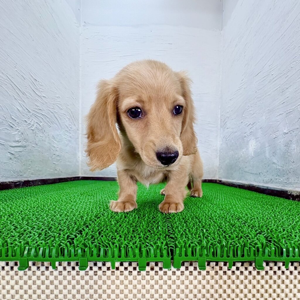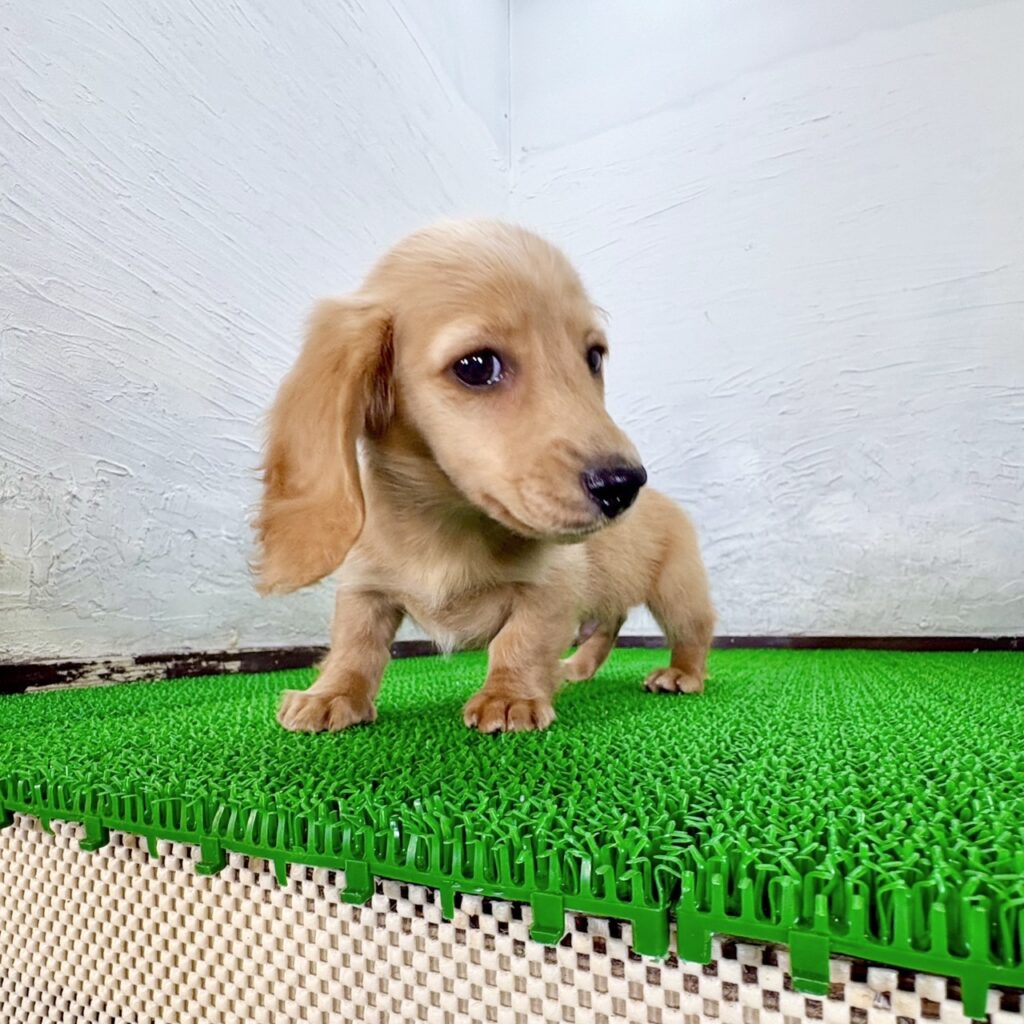 やわらかなゴールドカラーがとても魅力的な、ミニチュアダックスフンドの男の子です。