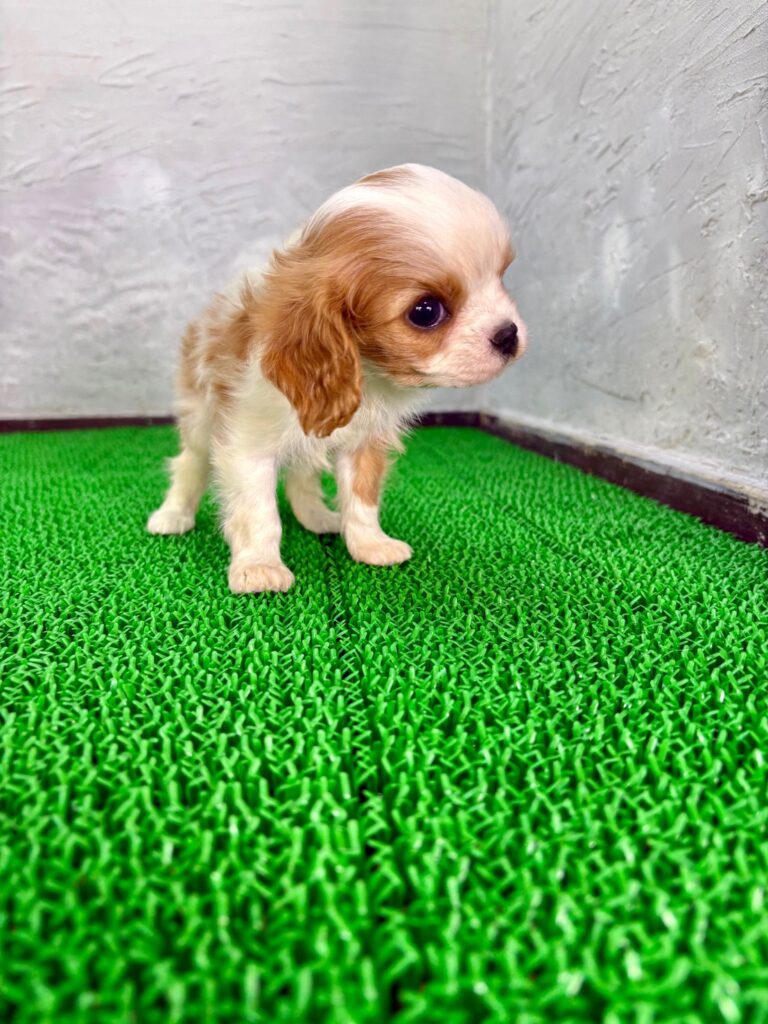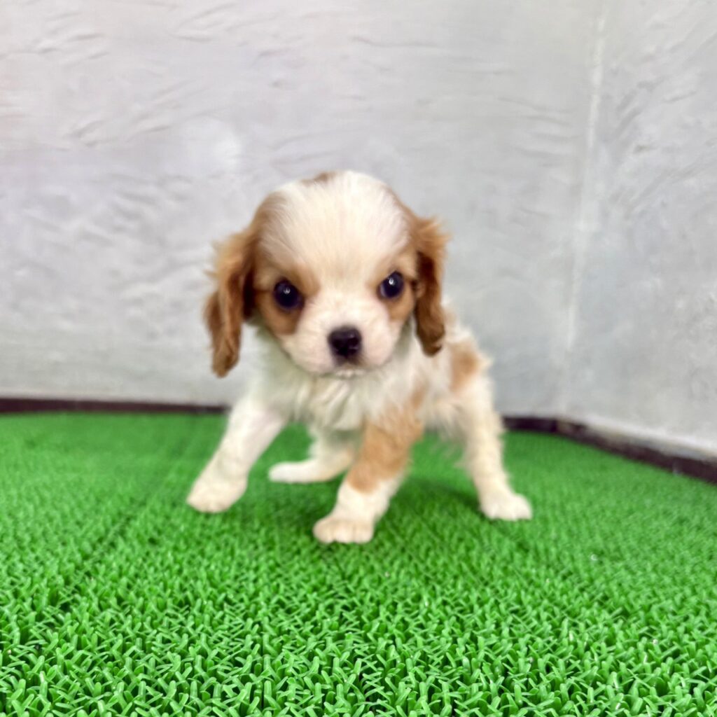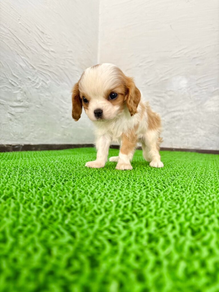 やさしい表情と気品ある佇まいが魅力の、キャバリア・キング・チャールズ・スパニッシュ、ブレンハイムカラーの女の子がマルプリティに仲間入りしました。ホワイトを基調に美しく入ったマロンカラーの模様はとても上品で、キャバリアらしい大きな瞳と相まって、思わず見とれてしまうほどかわいい子犬です。