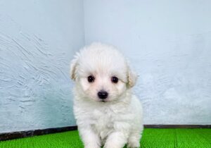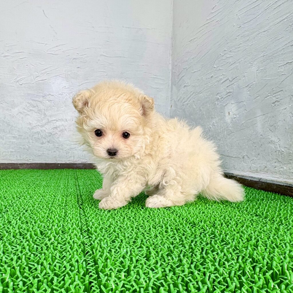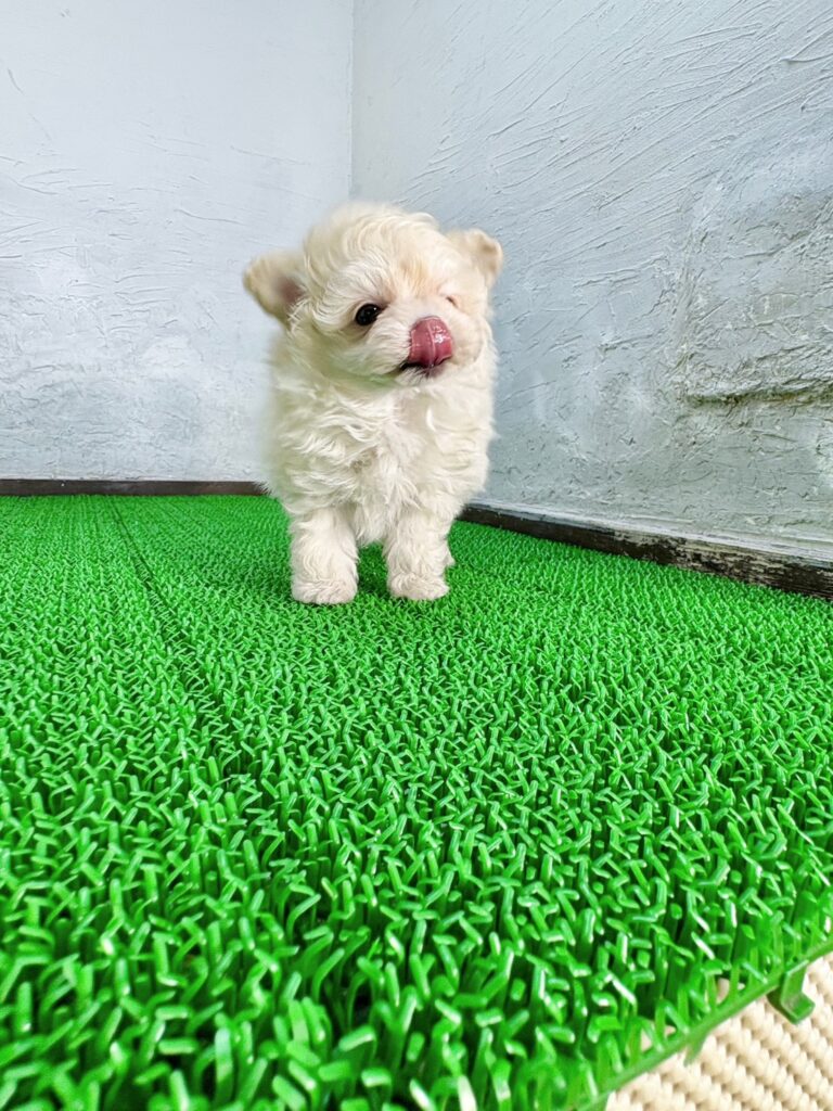 千葉・東京・関東エリアで子犬販売を行うマルプリティが、自信をもってご紹介するポメマルの男の子です。全体的に小さめな体つきで、手のひらに収まりそうなサイズ感が魅力の、とてもかわいい子犬。上品なシャンパンクリームの毛色と、ふんわり柔らかな被毛が合わさり、ぬいぐるみのような愛らしさがあります。ポメマルはポメラニアンとマルチーズの魅力をあわせ持つミックス犬で、小さめサイズでも存在感のある可愛さが特徴です。