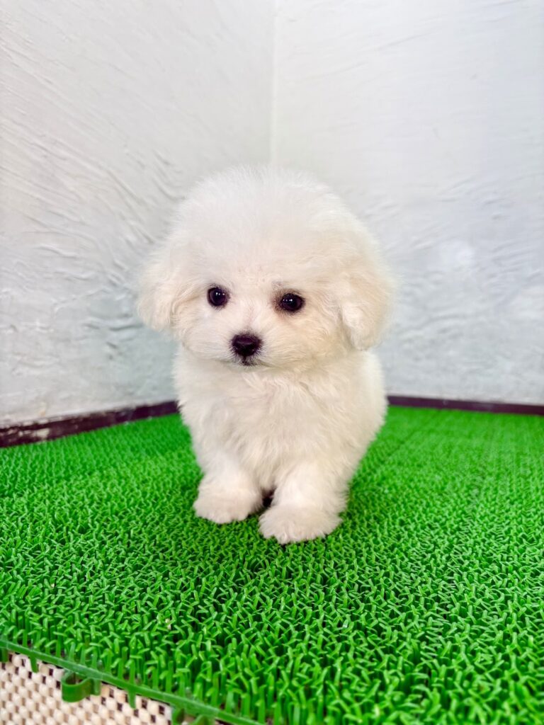 マルプリティでは家族経営ならではの工夫で中間費用を抑え、千葉・東京・関東エリアにて安心価格の子犬販売を行っています。ふんわり真っ白なビションフリーゼの男の子が、あたたかなご家庭との素敵なご縁を心待ちにしています。