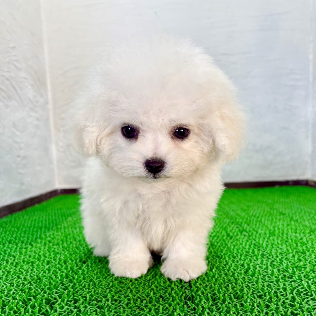 真っ白でふわふわの被毛がまるでぬいぐるみのような、ビションフリーゼの男の子です。思わず抱きしめたくなるような見た目のかわいい子犬で、明るく優しい雰囲気が魅力。表情も豊かで、ご家族の毎日を自然と笑顔にしてくれる存在です。